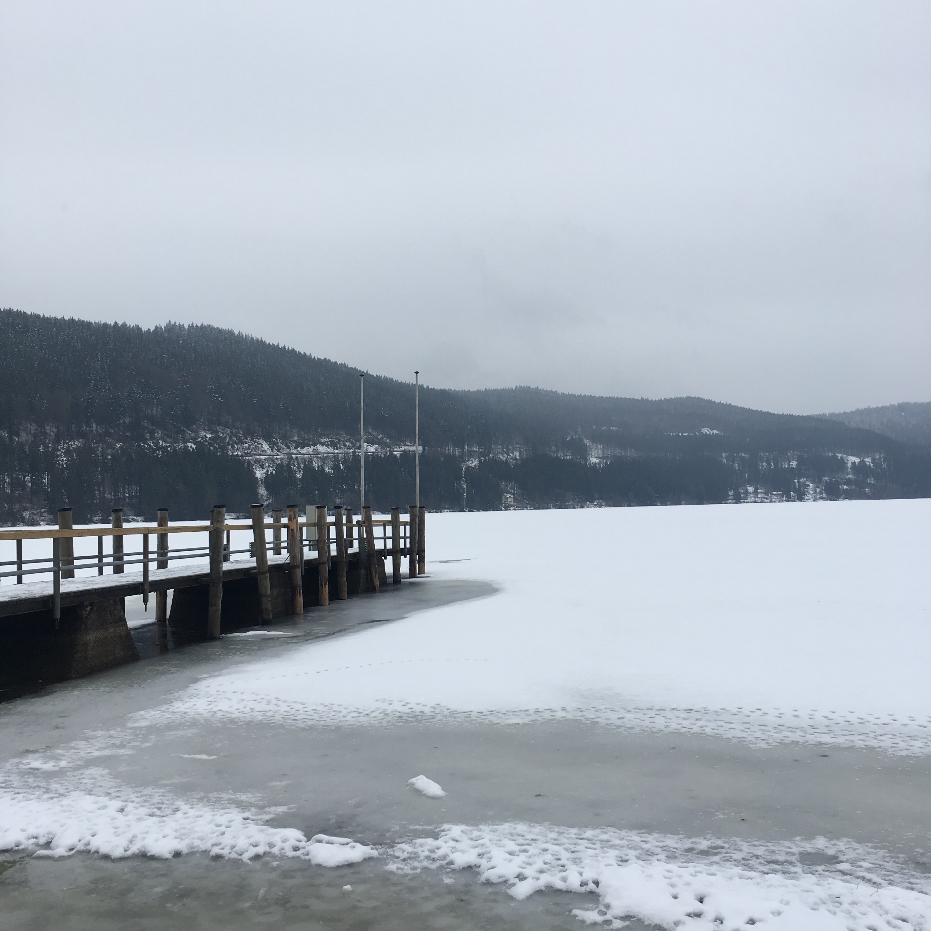 Nächster Halt war Schluchsee. Dort sind wir auf der Seite gewesen, wo kaum was ist außer eine Bahnhaltestelle und eine Wohngegend. Der See war teilweise vereist und sowie schon bei dem Titisee – Menschenleer. Ich habe ein paar schöne Bilder von der brechenden Eisfläche gemacht und dann wollten wir schon wieder weiter. Der kalter Wind dort hatte uns zum Schaffen gemacht.